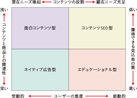 コンテンツマーケティングのどの手法を選ぶかは、商品特性を鑑み、「顕在化したニーズに応えるのか、潜在ニーズを掘り起こすのか」という軸や、「商品と直結したコンテンツがよいのか、商品にまつわる周辺情報から紹介するコンテンツがよいのか」「見込客の質を追うのか、量を追うのか」「検索行動を見込めるかどうか」などの軸で判断する必要があります。