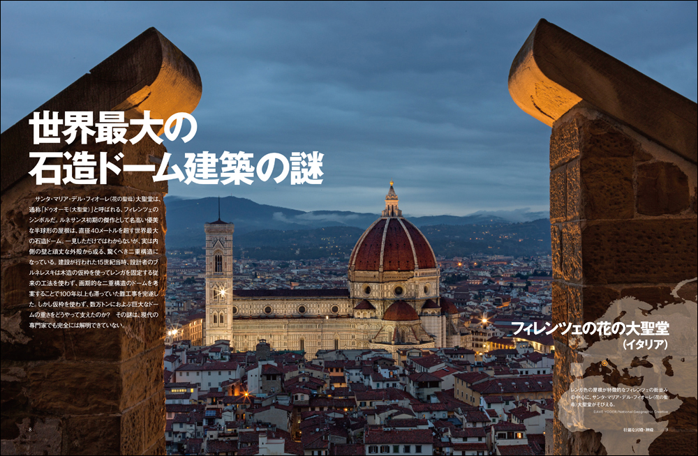 掲載されている写真は建築の細部のディテールまで見えるよう大きなサイズで収録されており、さらにその一枚一枚が美しいものばかりで眺めているだけでも世界を旅しているような気持ちにさせてくれる。シリーズを通して数々の文化や歴史を追ってきたナショナルジオグラフィックの最新作は、巨大で神秘的な世界の建築を通して文化や歴史を追うことができる保存版の一冊となっている。