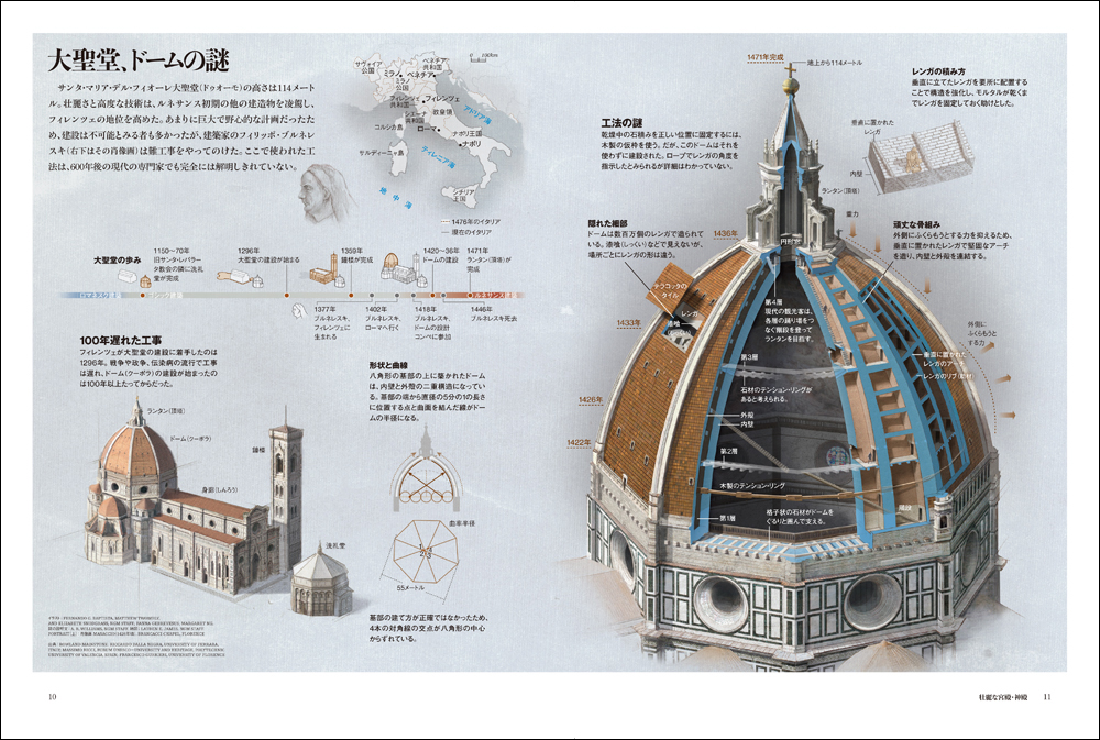 同書籍は有名な世界遺産から、現在も発掘が続く未だ謎の多い遺跡まで厳選された建築の内部に迫る研究解説書。人の手で生み出されてきた都市・宮殿・モニュメントについて世界中から9カ所を厳選し、取材した内容が収録されている。本書の魅力は何と言っても、一般的にはなかなか見ることの難しい建築の内部について詳細な画像付きの解説で丁寧に紹介されているところ。普段は見えない場所、解明されていない秘密、今は失われてしまった建築などをピックアップし、その細部までが丁寧に紐解かれている。