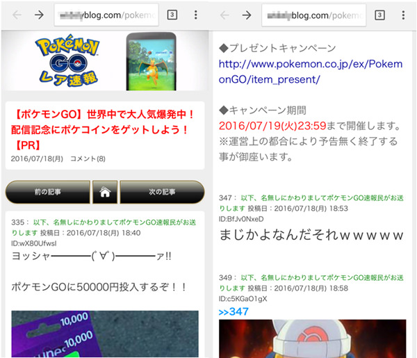このほか、まだポケモンGOが公開されていない日本を狙った詐欺的なWeb経由の誘導事例も確認している。この事例では、掲示板風のサイト上での書き込みに似せた表示により、偽のキャンペーン情報へ利用者を誘導する。