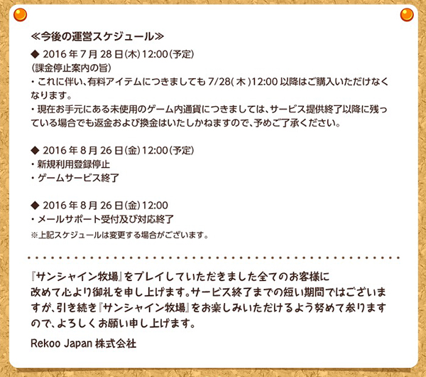 Rekoo Japan株式会社は、mixiゲームで展開していた牧場育成ゲーム「サンシャイン牧場」について、「お客様にご満足いただけるサービスを提供し続けることが困難な状況である」ために、8月26日をもってサービスを終了すると発表した。すでに本日28日から課金アイテムは販売が停止されている。