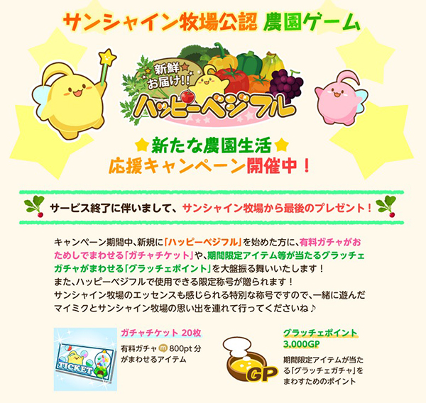 運営ではサン牧プレーヤーに対して、ゲームをプレイして本物の野菜がもらえるサンシャイン牧場公認農園ゲーム「ハッピーベジフル」への移行をおすすめしている。