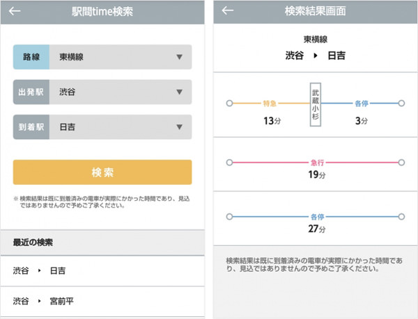 同機能は、路線と出発駅・到着駅を指定することで、直近の列車の所要時間実績を表示するサービスで、列車の種別(特急・急行・各駅停車等)ごとの所要時間も表示される。同社によると、このような機能を導入するのは鉄道業界では初めてだという。なお、検索は東急線内のみ、単一路線での検索となる。