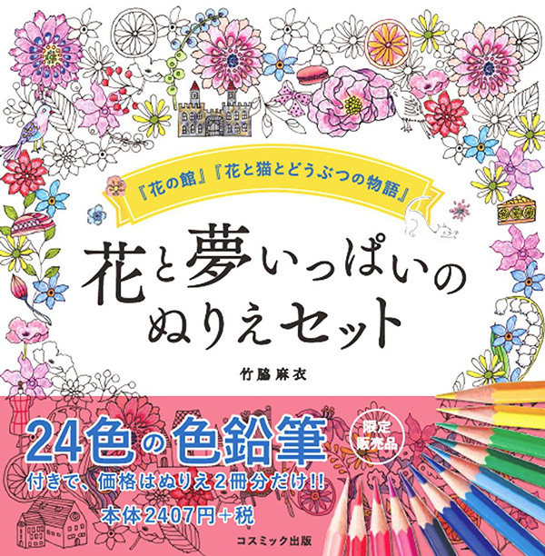 株式会社コスミック出版は、書籍「大人のぬりえ 花と夢いっぱいのぬりえ 本2冊+24色の色鉛筆セット」を発売。価格は2,407円(税抜き)。