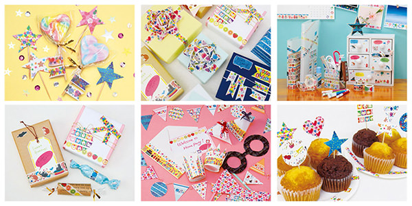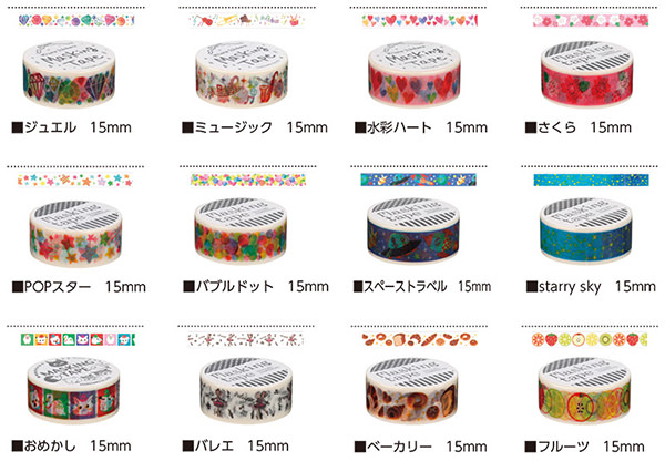 新たに登場した柄の内訳は、15mm幅タイプでジュエル / ミュージック / 水彩ハート / さくら / POPスター / バブルドット / スペーストラベル / starry sky / おめかし / バレエ / ベーカリー / フルーツ、25mm幅タイプでネコ・遊び / 鳥と街並 / 気球 / 夜景 / バースデーパーティー / 吹き出し。なお、これらのうち数点は「人気のアーティストシリーズ」とも名付けられている(ジュエル / ミュージック / 水彩ハート / 気球 / 夜景=石原美里さん、おめかし / ネコ・遊び / 鳥と街並=tamaさん)。