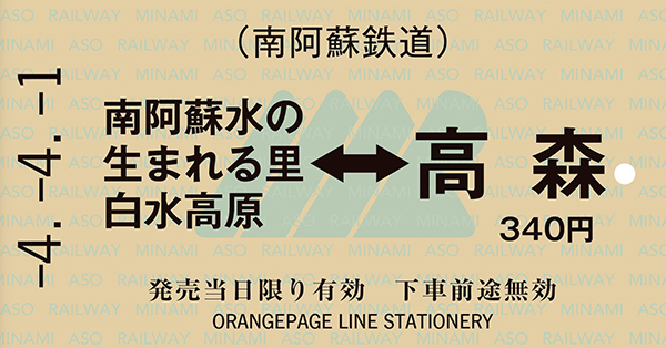 「南阿蘇水の生まれる里白水高原-高森」は、南阿蘇鉄道の日本一長い駅名の「南阿蘇水の生まれる里白水高原」と終着「高森」間のきっぷ。南阿蘇鉄道は熊本地震で運休し、7月から一部区間(中松〜高森)で運転再開となっていて、「南阿蘇水の生まれる里白水高原」駅も早期の開通が望まれている。