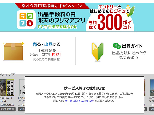 楽天オークション株式会社は4日、2006年から運営を開始したネットオークションサービス「楽天オークション」について、2016年10月31日をもって終了すると発表した。すでに新規出品者登録・新規ショップ登録は停止されていて、今後段階を踏んでサービスは終了される。