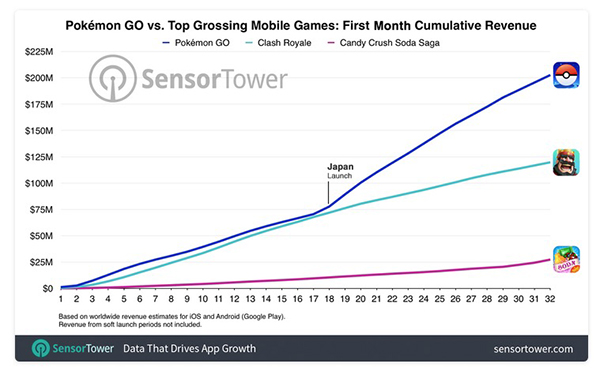 センサータワーによると、その売上げの伸びは、他の成功したアプリ「キャンディクラッシュソーダ」「クラッシュ・ロワイヤル」と比べても記録的であるという。グラフを見てみると、リリースから18日後までは「クラッシュ・ロワイヤル」とはほぼ同等の売上であったが、日本でのリリース後に売上げが跳ね上がっている。