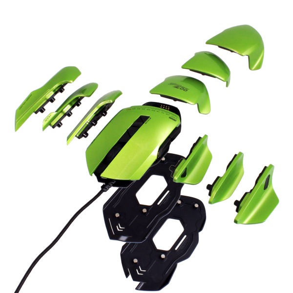 マウス本体に装着できるパーツは、左側面用、右側面用、上面用が各3種類、底面用が2種類で、合計11種類。パーツの中には追加のボタンがついているものもあり、設定用ソフトをインストールしたPCを使って、ボタンの機能やDPI、LEDライトなどの設定も行える。