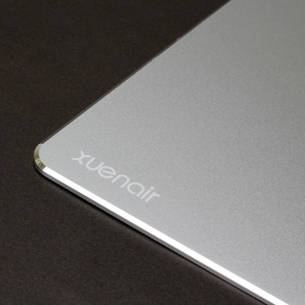 外観は、素材を生かしたシンプルなデザインで高級感があり、シルバーとピンクゴールドの2色を用意している。アルミ素材の厚さは3mmで、表面の梨地加工でサラっとした触感となっており、エッジを切削加工してデザインアクセントになっている。裏面は滑り止めのシリコンゴムを装備しており、激しいマウス操作でもマウスパッドが動く心配がない。また、布製マウスパッドのように汚れが溜まることがなく、表面が汚れても簡単に落とすことができる。
