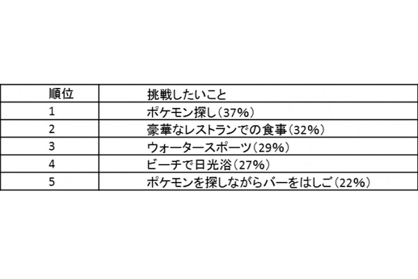 さらに、「次の休暇中に挑戦したいこと」のランキングでは「ポケモン探し」が37%を占め、第1位となった。また、「ポケモンを探しながらバーをはしごして楽しみたい」と回答した人も5位で22%に上る。また、49%の回答者は、「ポケモンを探すために、旅行先のランドマークとなる有名な建物の探索に、これまでの旅行と比べて、より多くの時間を費やすであろう」と回答している。