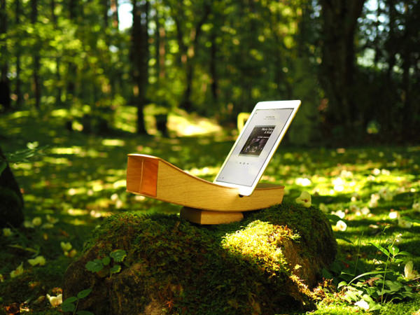 同製品は、電源不要で置くだけで使用できる木製スピーカーボックス。岐阜県付知町の木工作家である早川直彦氏が一つ一つ丁寧に造り上げるもので、天然の国産の栗の木を使用し、曲線で仕上げたデザインとなっている。iPhone/iPadに合わせたスリット設計により、置くだけで簡単に使用できる。