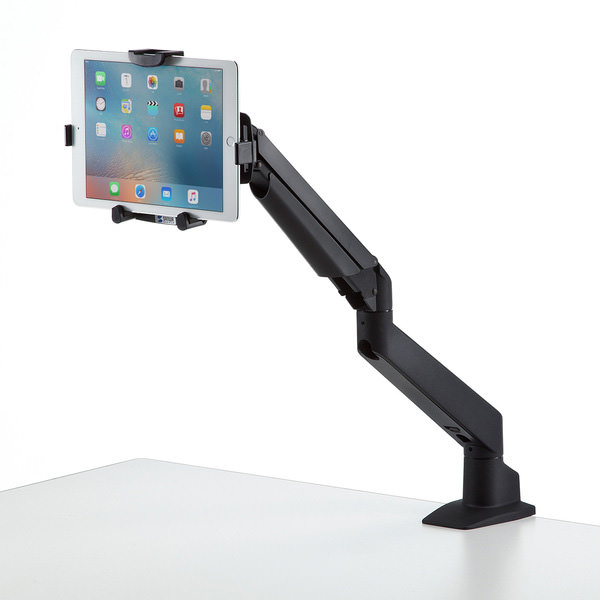 本製品は0.5〜5kgまでの荷重に対応し、これまでは軽すぎてモニターアームに設置できなかったようなタブレットも搭載できる。5kgまでの重量であれば、VESA対応の液晶TVやディスプレイも搭載できるなど、幅広い製品に対応するモデルだ。ガスシリンダーを内蔵した垂直アームを採用しているため、強い力を入れなくても上下垂直方向へスムーズにタブレットを動かすことが可能。左右水平方向へ動かすための関節は複数あり、使いやすい位置へと自由に動かせる。