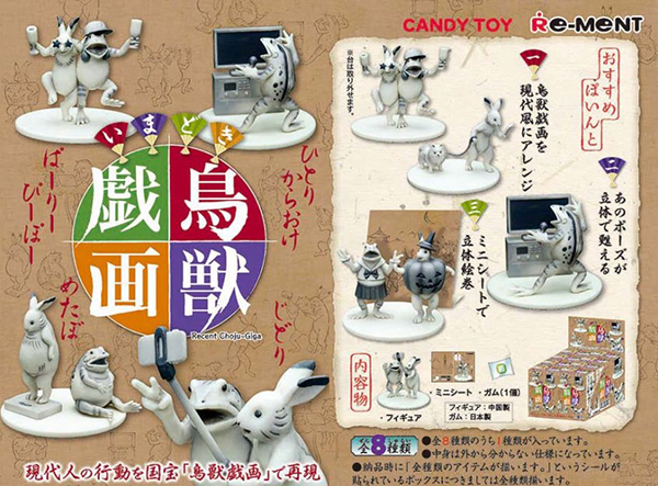 本アイテムは、フィギュア+ミニシート+ガム(1個)からなる食玩商品。現代人の行動を国宝「鳥獣戯画」で再現したもので、「あるきすまほ」「しゃちく」「おたげい」「ひとりからおけ」など、社会問題や社会現象を「鳥獣戯画」の主人公的存在、兎と蛙で表現している。タイトルを見ないでもフィギュアだけを見れば十分に何を表しているかわかるが、付属のミニシートを背景にすれば、立体絵巻として楽しむことも出来る。