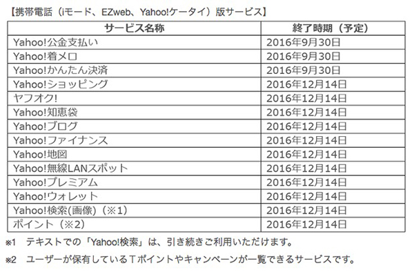 ヤフー株式会社は1日、2016年内に終了する携帯電話版サービス(iモード、EZweb、Yahoo!ケータイ)の一覧を公開した。