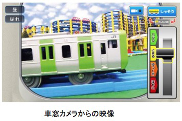 先頭車両の運転席に設置された「運転士カメラ」では運転士の目線が楽しめ、車体側面にある「車窓カメラ」からは、乗客目線でプラレールの世界に浸れる。