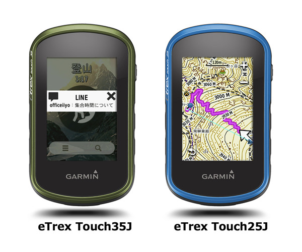 「eTrex Touch 25J」と「eTrex Touch 35J」は、これまでハイエンドモデルのみに採用されていたカラータッチパネルをミドルレンジモデルに採用したもので、両モデルともに三軸電子コンパスを搭載している。「eTrex Touch 35J」はBluetoothでのスマートフォン連携やANT+でのセンサー接続など、ワイヤレス機能を搭載している。
