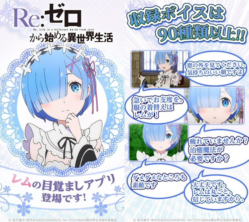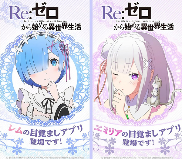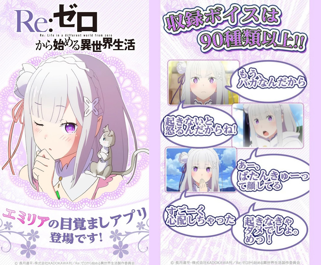 ショウゲートは、人気テレビアニメ「Re:ゼロから始める異世界生活」の人気キャラクターの声で起こしてくれる目覚ましアプリ「リゼロアラーム ~レム編~」「リゼロアラーム ~エミリア編~」を配信している。アプリはiOS/Android版がそれぞれApp Store・Google Playでダウンロードでき、価格は各720円(税込)。