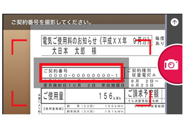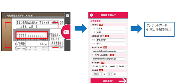 検針票・領収書に記載されている契約番号・お客様番号をスマートフォンのカメラで撮影し、氏名やメールアドレスなどを入力してアプリ上で申し込めばクレジットカードでの支払いが完了する。