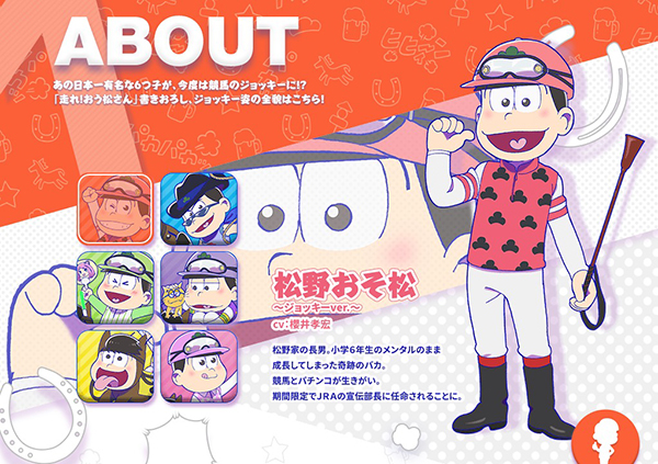 日本中央競馬会(JRA)は13日、テレビアニメ「おそ松さん」とのコラボ企画「走れ!おう松さん」を発表した。スペシャルサイトでの動画公開や限定グッズ販売、完全新作アニメの放送など、豊富なコンテンツを用意している。