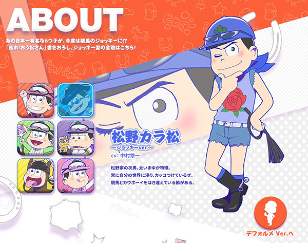 10月13日にオープンしたスペシャルサイトでは、6つ子のジョッキー姿や、TVアニメの声優が集結したオリジナルWebムービー「6つ子とおうまの物語」(全6話)、Webゲーム「大予想!松野家カップ(10月17日公開)」などが公開されている。