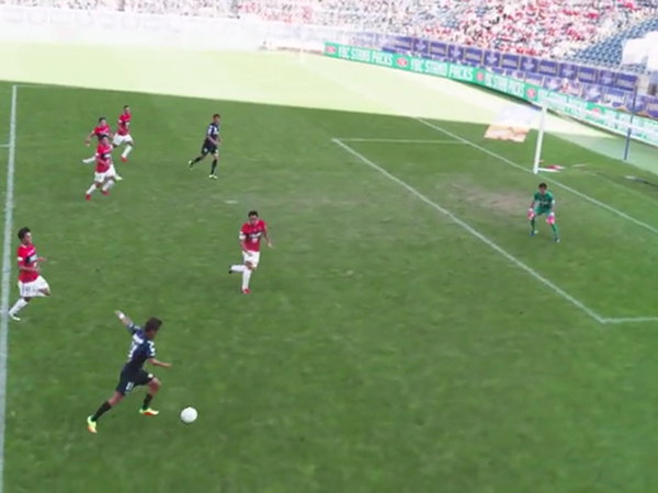 サンプル映像は「JリーグYBCルヴァンカップ決勝戦」のシーンを編集したものを公開。「シュートシーン」はキッカーに寄りの映像からキーパーのアップへと遷移し、「アタッキングサードのパスからシュート」の流れは、ピッチレベルから俯瞰、さらにキーパーのアップへと移り変わり臨場感が味わえる。
