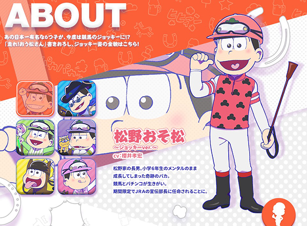 2015年10月〜2016年3月まで放送されたTVアニメ「おそ松さん」とJRAのコラボの一環として企画された新作アニメ。スタッフが再集結した「走れ!おう松さん」では、6つ子が競馬の騎手になり、ビッグなカリスマジョッキーを目指すというストーリーだ。特設サイトでは、競馬とパチンコが生きがいという松野おそ松を筆頭に、6つ子がそれぞれのスタイルでジョッキー姿を公開している。