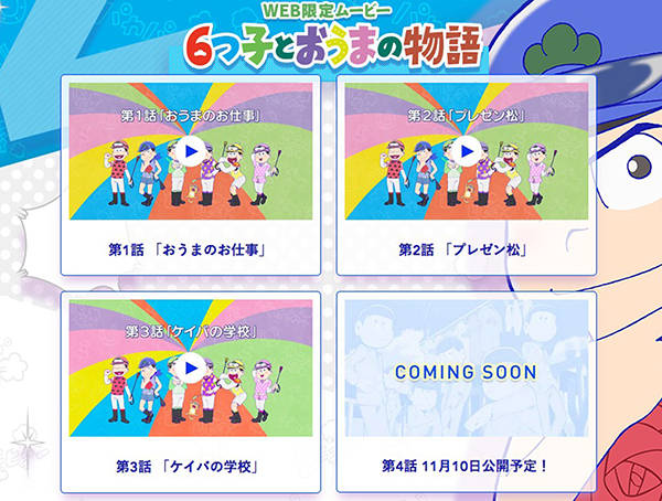 コラボでは、全6話のWeb限定ムービー「6つ子とおうまの物語」を順次公開するほか、ブラウザゲームやTVCM、競馬場内でのグッズ販売など多方面でおそ松さん×JRAの企画を展開中だ。