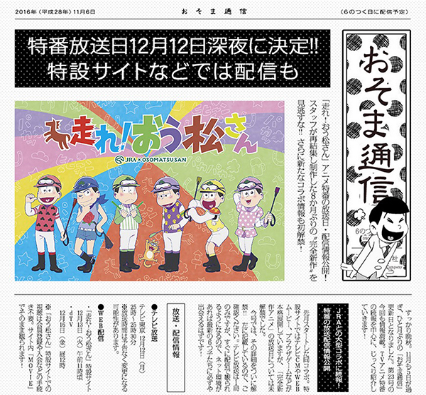 TVアニメ「おそ松さん」公式サイトでは、情報コンテンツ「おそま通信」23 号を更新、完全新作アニメ「走れ!おう松さん」の放送日が12月12日25時〜25時30分(テレビ東京)に決定したと発表した。また、特設サイトでは翌13日午前11時頃から、dTVでは16日12時〜、それぞれWeb配信される。