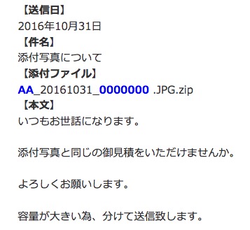 今回確認されたフィッシングメールは、件名「添付写真について」、添付ファイル「AA_20161031_0000000 .JPG.zip」となっているもの。添付ファイルは写真や文章などを装ったマルウェアになっているので、絶対に開かないように要請している。