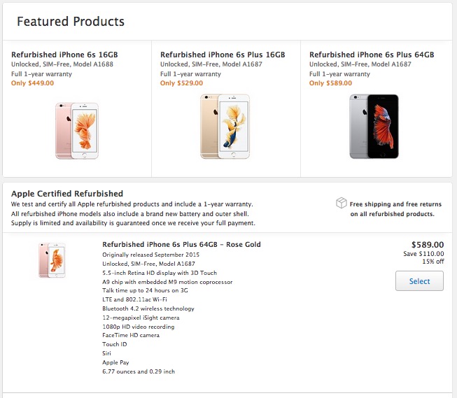 さらに、米Appleでは公式で整備済みのiPhoneの取扱を開始。Featured(リファービッシュ)品として、「iPhone 6s」16GBを449ドル、「6s Plus」16GBを529ドル、「6s Plus」64GBを589ドルで販売している。