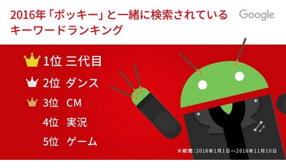 Googleは11日、11月11日が「ポッキー&プリッツの日」であることを記念して、「ポッキー」と一緒に検索されているキーワードランキングを発表した。調査期間は2016年1月1日〜11月10日。