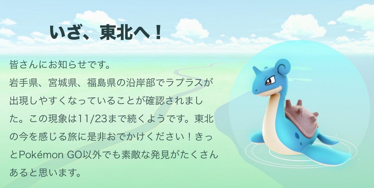 Pokémon GO Japanの公式Twitterアカウントで、東北3県でラプラスが出現しやすくなっていることが発表された。