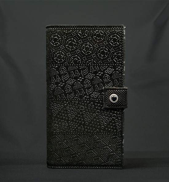 ケースの装飾金具は、山梨県でジュエリー製造卸を営む株式会社 秋山製作所が担当。メンズモデルにはシルバー925やオニキスが用いられて“いぶし仕上げ”を採用しており、レディースモデルにはシルバー925やガーネットが用いられて“ニッケルロジウムメッキ”仕上げを採用している。ロゴジャガード生地の製織や防撥水などの加工をはじめ、「織」に関わる部分を手掛けたのは創業1866年の槙田商店。さらに、鹿革に漆で模様を付ける伝統工芸品「甲州印伝」の店である「印伝の山本」が製作に携わっており、「甲州印伝」の伝統技法はそのままに、今回のケース用に新しい柄 / 形状を採用している。