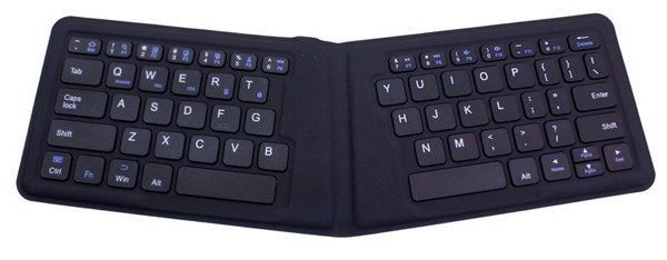 同製品は、厚さ13mm、重量170gの二つ折キーボード。と小型・軽量なことに加えて、キーピッチ18mmで打ちやすく、自然なポジショニングでタイピングできるV字設計を採用している。スタンドにもなるケースが付いており、スマートフォンやタブレットを立てて使うことができる。