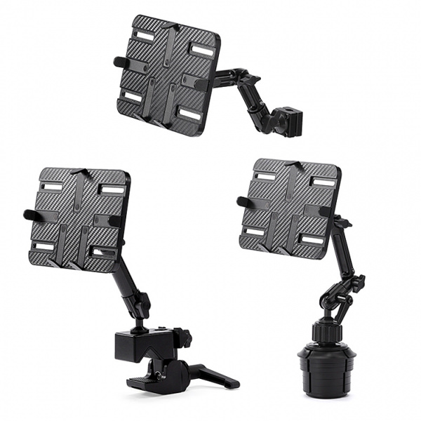 「200-CAR044」は、ヘッドレストポールに設置が可能な後部座席向けのタブレットアーム。3関節で縦方向・横方向へ自由に動かせる。