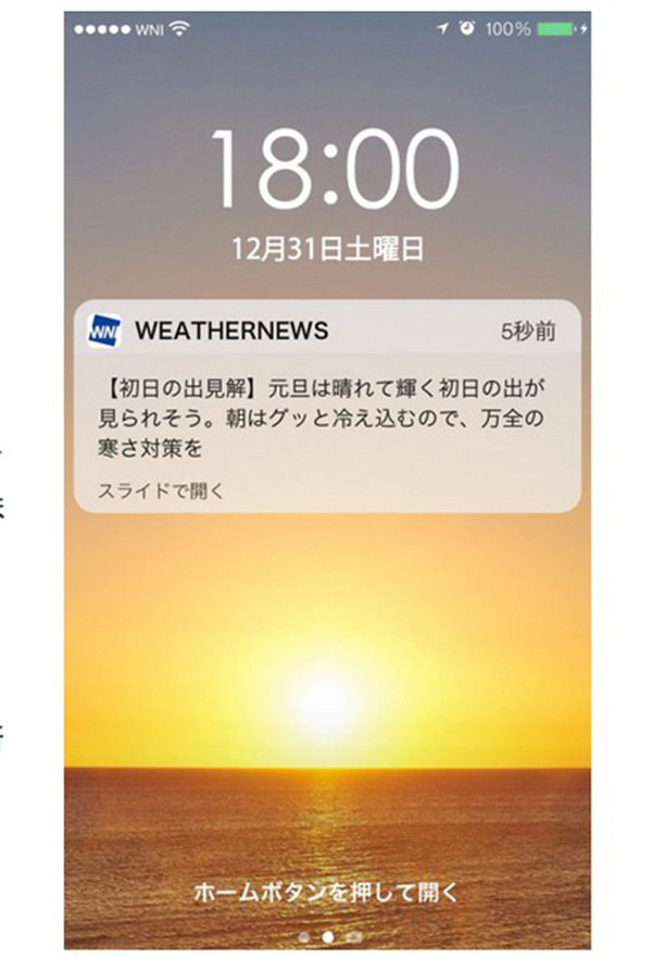 株式会社ウェザーニューズは26日、初日の出が見られるかどうかを大晦日にプッシュ通知で知らせる「初日の出情報」の登録を開始した。