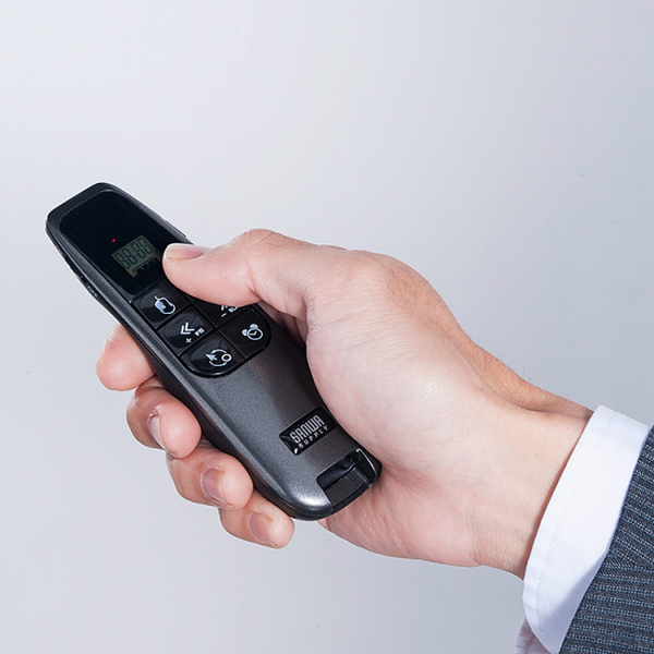 PowerPointやKeynoteで使用できるページ操作ボタンを搭載するほか、タイマー機能も搭載しており、プレゼンテーションの持ち時間を管理できる。また、電池残量表示機能により、未然に電池切れを防ぐこともできる。