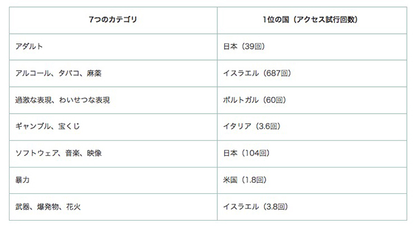 調査では、対象ユーザー1人あたりが、2015年12月から2016年11月までの1年間に、危険だとみられるWebサイトにアクセスを試みた回数を計測。その結果、日本の子供は「アダルト」と「ソフトウェア、音楽、映像」のカテゴリにおいてアクセス試行回数がトップになった。