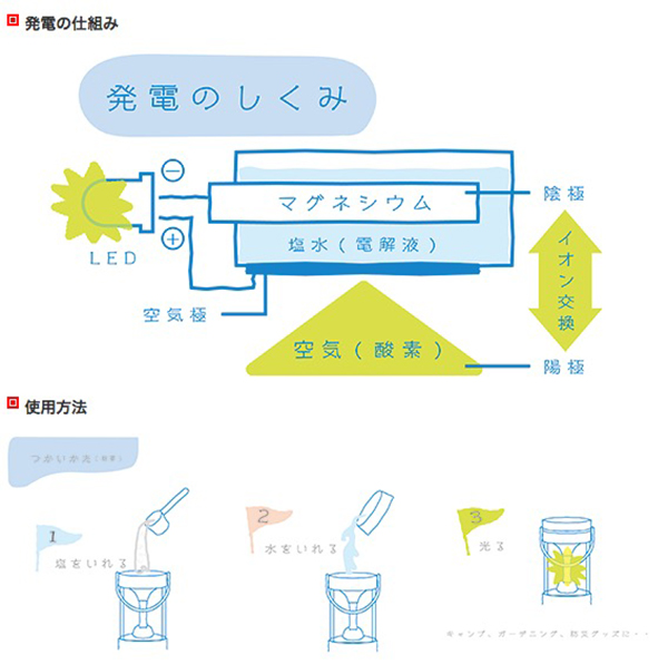 本製品は、本体にマグネシウム合金(パワーバー)を搭載したLEDランタン。水と塩をランタン上部から入れると、マグネシウム合金が陰極(-極)、塩水が電解液となる。さらに、空気極から空気(酸素)を取り入れて陽極(+極)の役割を果たし、陰極と陽極でイオン交換が行われて発電する。