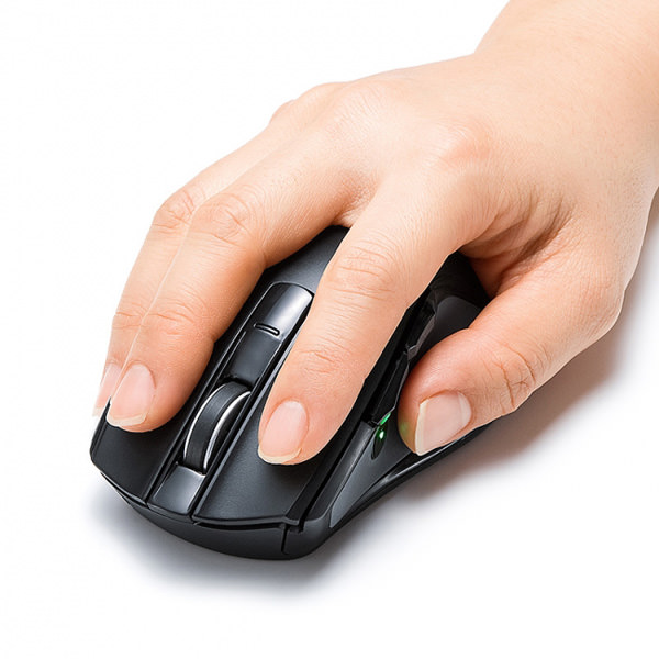 赤色の光学式を採用し、感度の高いブルーLEDセンサーを搭載しており、光沢感のあるガラス面でもスムーズな操作感を実現する。エルゴノミクスデザインとサイドラバーグリップにより、快適な操作が可能で、手元のサイドボタンにも「戻る・進む」の2ボタンを搭載している。