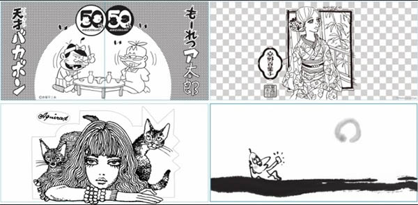 左上から時計回りに赤塚不二夫(漫画家/フジオプロ)、安野モヨコ(漫画家)、しりあがり寿(漫画家)、宇野亞喜良(イラストレーター)の作品