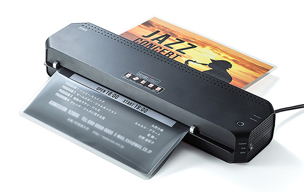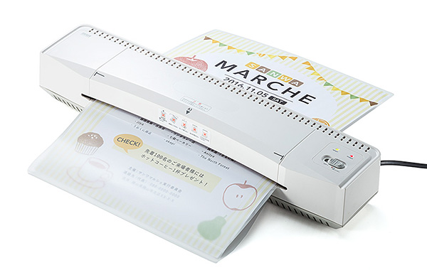 一方の「400-LM003」は、2本ローラーで加熱 / 圧着を1度に行う仕様であるため、4本ローラーモデルよりは比較的に安定性には欠けるが、手頃な価格でラミネーター入門者にも導入しやすい製品だ。対応フィルムの厚みは100μm。使用の際には、約5〜8分のウォームアップ時間が必要とされる。本体サイズは495(幅)×80(高さ)×108(奥行)mmで、重量は約1.7kg。なお、「400-LM004」の最大ラミネート幅は325mm、「400-LM003」は最大330mmであるが、A4サイズやカードサイズ、名刺サイズ、はがきサイズのような小さめのサイズの用紙のラミネート加工も行える。