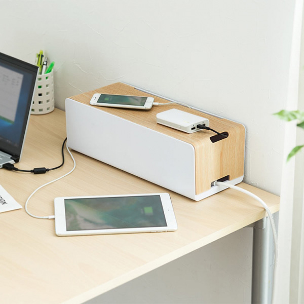 同製品は、電源タップやケーブルをきれいに収納できるボックスで、外観は部屋に溶け込みやすい木目調となっている。上面部は内側に湾曲しており、設置したスマートフォンやリモコンなどがくぼみで支えられて、安易な落下を防ぐデザインとなっている。