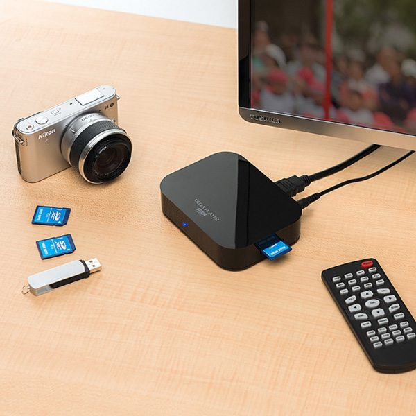 同製品は、デジタルカメラで撮影した写真や映像、PCで作成した動画などを、テレビやプロジェクターで再生できるメディアプレーヤー。動画や写真、音楽データなどをUSBメモリ、またはSDカードに保存して本製品に接続することにより、PCを使うことなく再生できる。