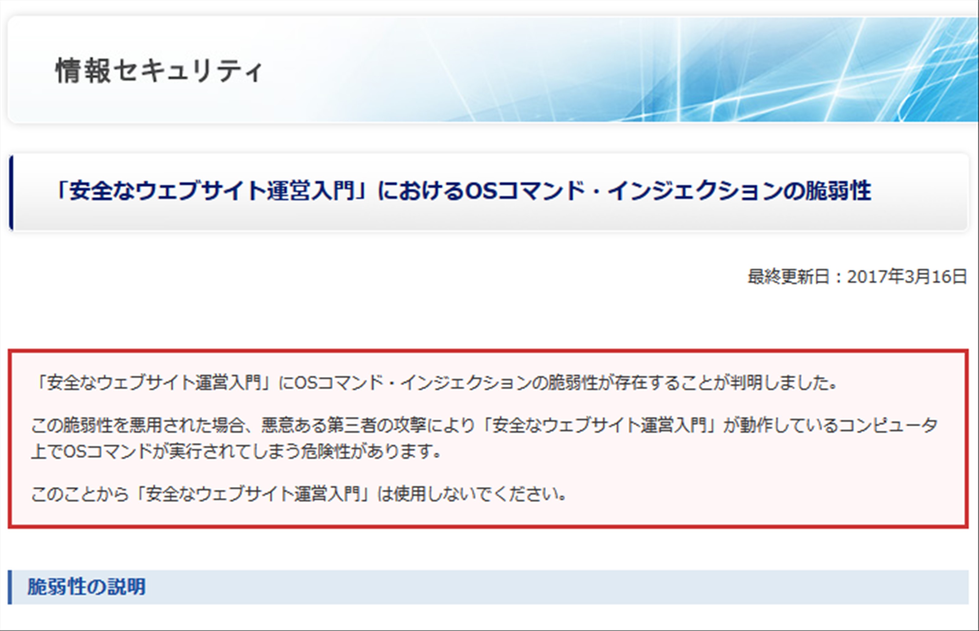 「安全なウェブサイト運営入門」は、セキュリティ対策の重要性を伝えるために公開されたツール。判明した脆弱性を悪用すれば、悪意ある第三者の攻撃により、「安全なウェブサイト運営入門」を動作させているコンピュータ上で、OSコマンドが実行される危険性がある。