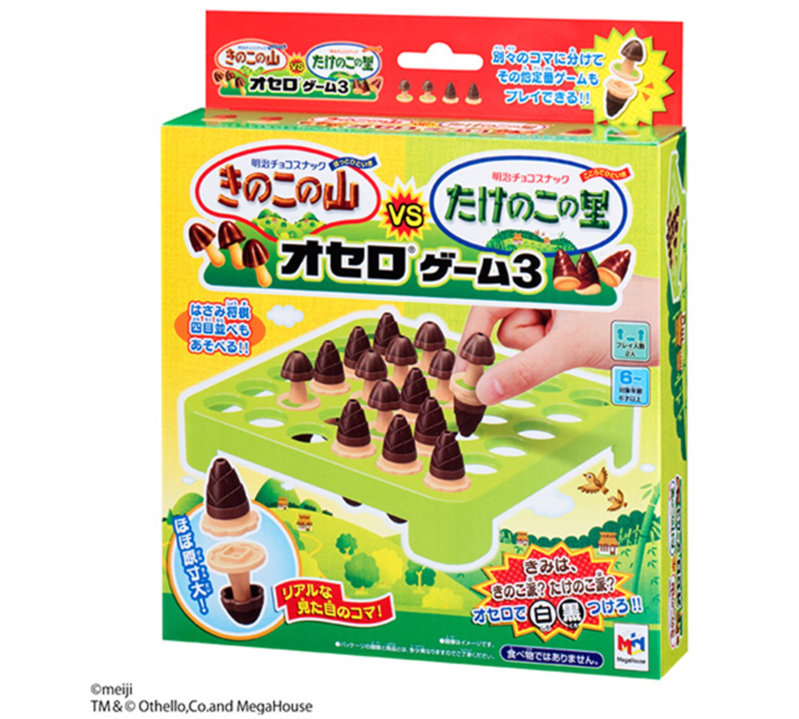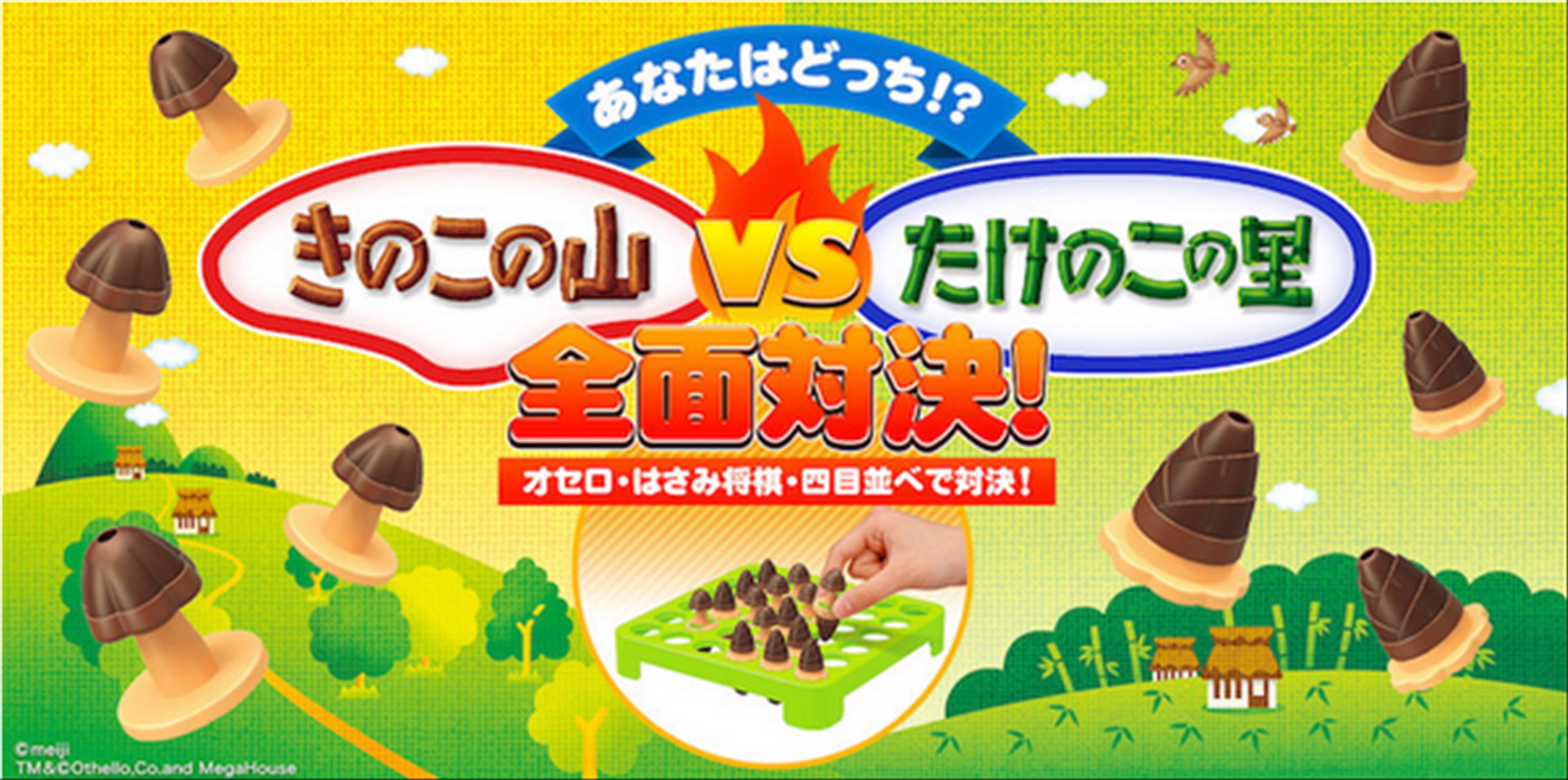 今回の対戦には、2017年1月に発売された、ほぼ原寸大のきのこの山とたけのこの里のフィギュアを使って遊ぶ「きのこの山VSたけのこの里 オセロ ゲーム3」を使用。対戦するのは、将棋界、囲碁界、オセロ界のトップ棋士や達人で、それぞれきのこ派・たけのこ派に別れ、「はさみ将棋」「四目並べ」「オセロ」で対決する。