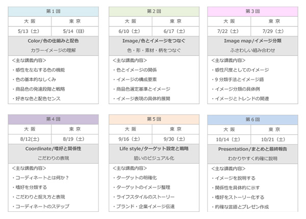 本セミナーは、月に1回のペースで全6回で実施される。東京と大阪の会場があり、それぞれ定員は15名だ。東京会場はAP品川(東京都港区高輪3-25-23 京急第2ビル)で、開催日程は5月14日(日)、6月17日(土)、7月29日(土)、8月19日(土)、9月30日(土)、10月21日(土)。大阪会場は色彩検定協会 新大阪研修室(大阪府大阪市淀川区宮原3-4-30 ニッセイ新大阪ビル 16F)で、5月13日(土)、6月10日(土)、7月22日(土)、8月12日(土)、9月16日(土)、10月14日(土)に開催される。会場間での振替受講も可能。たとえば「6月だけは東京会場ではなく大阪会場で受講したい」といった希望にも柔軟に対応してもらえる。