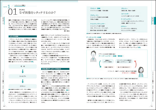 たとえば、撮影した写真を広告として世に出すためには、写真の「補正」はもちろん、事前のコンセプト作成、プランニングやフォトディレクションが必須となる。本書のメインテーマは「写真の補正」であるが、まずはなぜ画像をレタッチするのか? という、目的・コンセプト・デザインといった、作品ができあがるまでの流れを知ることから、その必要性を説いていく。
