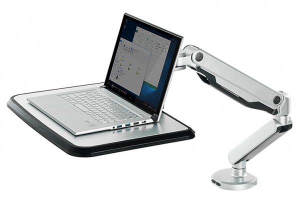 同製品は、ノートPCを設置したまま上下できる天板一体型のノートPCアーム。アーム部分はネジ止めなどの調整は不要で、ガス圧式でスムーズに昇降させることができる。